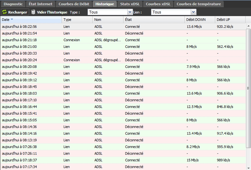 L’exemple suivant montre les désagréments subis par un abonné. Sa liaison Internet est interrompue en permanence, les débits sont variables.