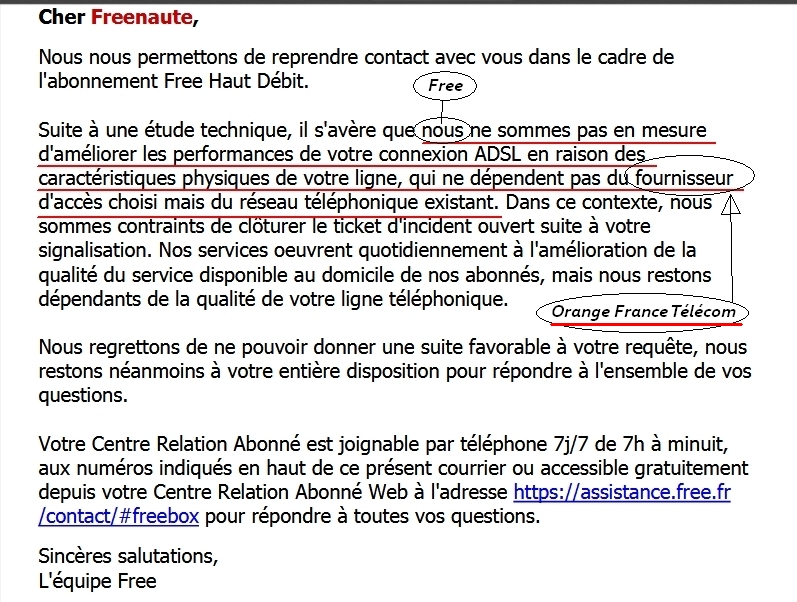 Le message de l’opérateur Internet qui clôt le ticket incident est à ce titre éloquent (voir ci-dessous). Le ton est poli, mais il masque le fait que l’abonné ne connait que l’opérateur (ici Free). Free rejette la responsabilité sur autrui (Orange-France Télécom), ce qui est pratique. Free montre ici son défaut de maîtrise de son propre fournisseur.