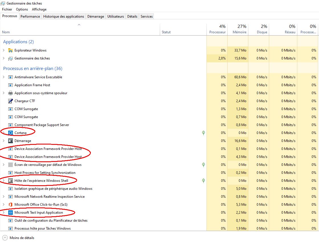 Ajoutons que certains processus s’ouvrent sans que nous en ayons besoin comme le « Microsoft Text Input Application », « Cortana » (l’intruse), ou le suivi de l’expérience Shell (Hôte de l’expérience Windows Shell).