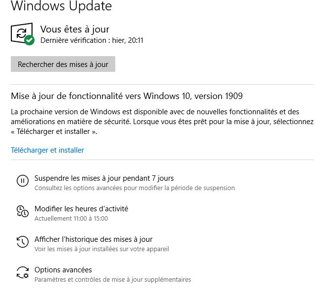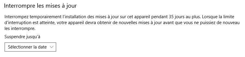 Microsoft vous accorde un répit dans les mises à jour : vous pouvez suspendre les mises à jour pour une durée allant jusque 35 jours. Mais à quoi bon ? Puisque dans tous les cas, Microsoft imposera la mise à jour du système d’exploitation lorsque cette limite sera atteinte, afin de pouvoir à nouveau les interrompre. Pas le choix !