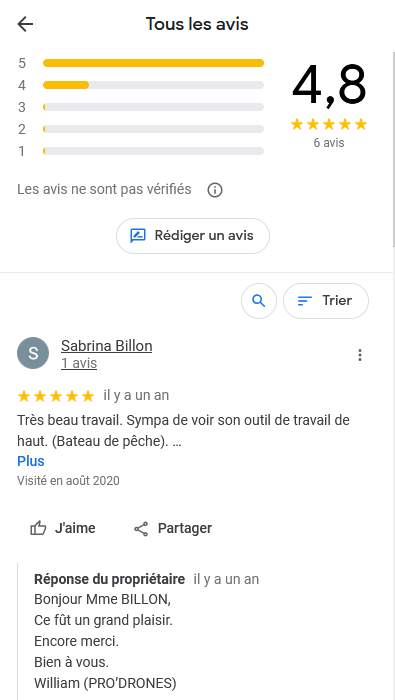 De plus, l’activité est mentionnée comme « photographe aérien » et non « vidéo surveillance ». Enfin, un avis parle de matériel nautique (bateau) or, à proximité d’Angers, ce qui ressemble à la mer sur la photo n’existe pas.