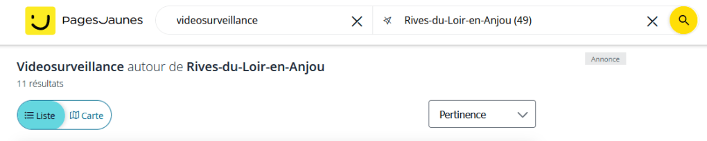 Toutes les entreprises ne sont pas sur Google ! Autre recherche sur un fondamental de la visibilité des entreprises sur internet : les pages jaunes. Deux recherches ont été faites : par activité, vidéo surveillance, photographie aérienne, puis par le nom de l’entreprise. Les deux recherches contiennent la localité indiquée sur le prospectus.