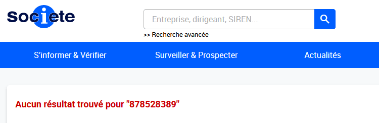 Le numéro de SIRET ne correspond à aucune entreprise immatriculée. La source officielle est complétée par une recherche sur d’autres sites spécialisés. Ainsi sur Societe.com, le message « aucun résultat trouvé » est renvoyé par le site web (https://www.societe.com/cgi-bin/search?champs=878528389).