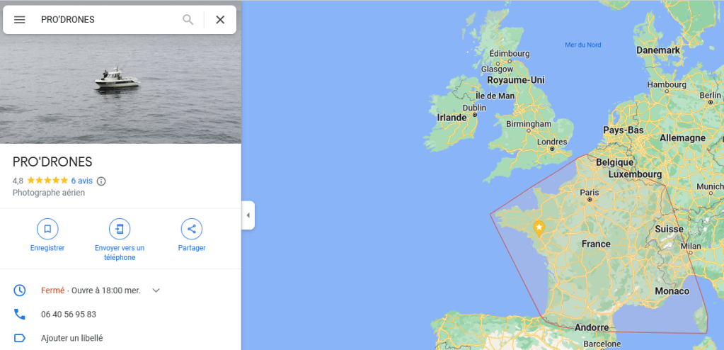La recherche de l’entreprise sur Google Maps donne des résultats troublants. Prod’drones laisse des traces jusqu’en 2020 (commentaires laissés par les utilisateurs). Mais sa localisation géographique n’est pas disponible.